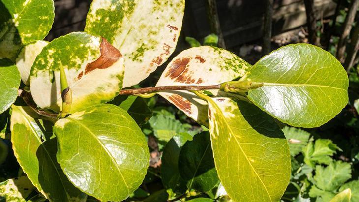 Eğer yaprakların kenarlarında kahverengi yahut sarı lekeler oluşmuşsa bu güneş yanığının bir işaretidir. Yapraklar güneş ışığı tarafından yanmıştır zira su damlacıkları mercek üzere davranarak ışığı odaklar.