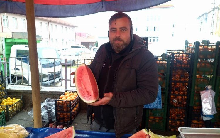 Bilecik merkezden Pazaryeri ilçe pazarına meyve satmaya gelen pazarcı Oğuzhan Yıldırım’ın tezgahını süsleyen karpuz dilimleri kilosu 60 liradan müşteriye sunuldu.