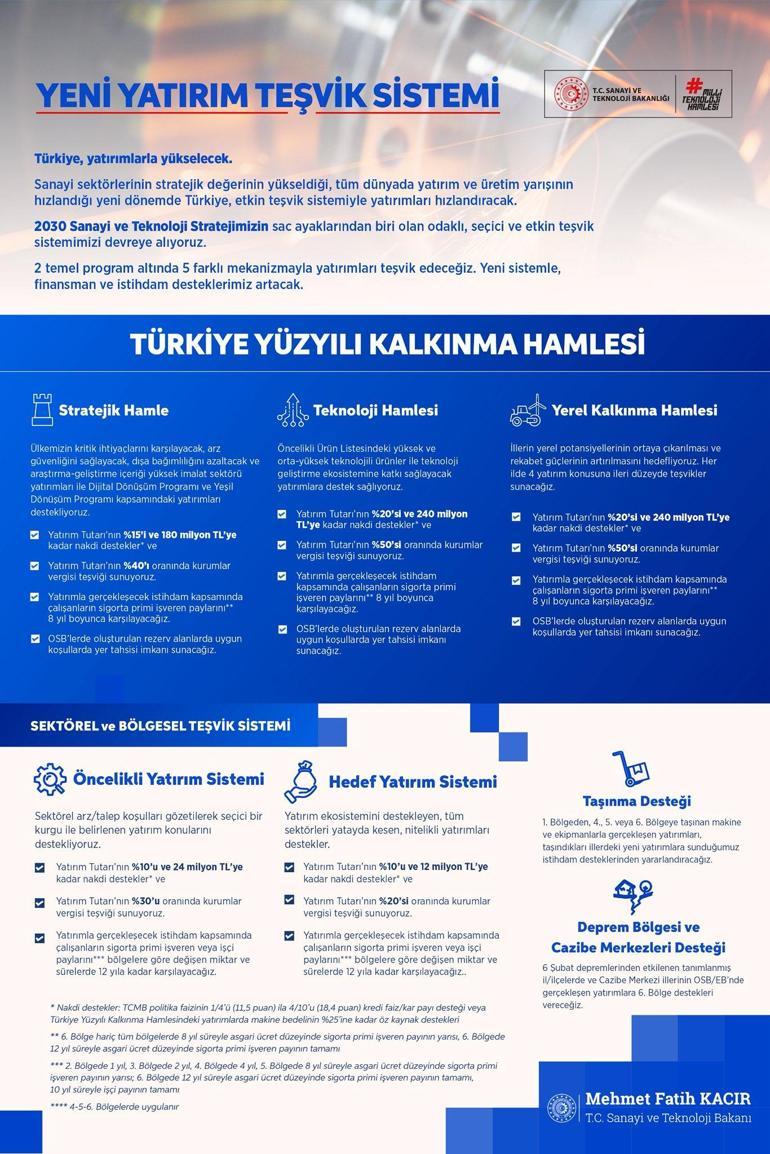 “Genel Teşvik Sistemi’ni sonlandırdık. Böylece teşvik sistemine dahil etmediğimiz bölümlere ve eserlere yönelik yatırımlarda kullanılan makine ve teçhizatın gümrük vergisi muafiyetini kaldırdık. Yerli makine üreticilerimizi koruduk. Türkiye Yüzyılı Kalkınma Atılımı kapsamındaki yatırımlara OSB’lerde oluşturulan rezerv alanlarda, uygun şartlarda yer tahsis edilecek. 1. Bölge’deki (en yüksek sosyo-ekonomik gelişmişlik seviyesindeki illerdeki) makine ve teçhizatın, 4., 5. ve 6. bölgeye taşınması ile gerçekleşen yatırımlar için taşındıkları bölgedeki istihdam teşviklerini uygulayacağız. Böylece sanayi tesislerinin bilhassa Marmara Bölgesi’nden, Anadolu kentlerine taşınmasını sağlayacağız. OSB’lerde ve sanayi bölgelerinde gerçekleşen yatırımlara bir üst bölge vilayetlerinde uyguladığımız – daha ileri – teşvikleri sunarak planlı endüstrileşmeyi destekleyeceğiz. Yeni yatırım teşvik sistemi 31 Aralık 2030 tarihine kadar sürecek.”