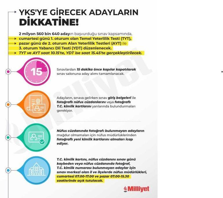 Adayların imtihan saatinden en az bir saat on beş dakika evvel imtihan binalarında hazır olması gerekiyor. Adaylar, imtihanın sabah oturumlarında 10.00, öğlenden sonra oturumlarında saat 15.30’dan sonra imtihan binalarına alınmayacak.